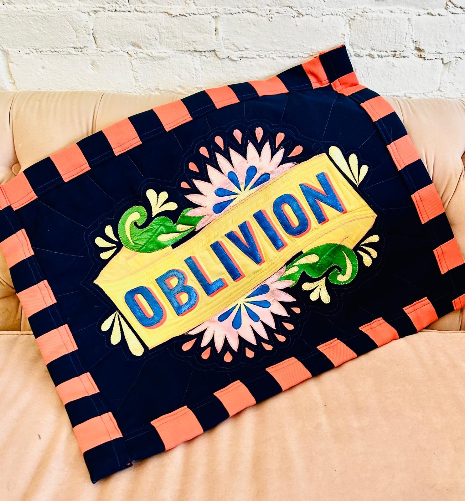Textile artist from Worthing, creating work with natural fibres and fabric-based processes. Her practice explores textiles as part of the human experience, materials we wear, live with and pass on as a medium and a means of connection. The work moves between quilted, material-led pieces and brighter, text-based compositions that use stitched words as part of the surface. Across both approaches, there is a focus on construction, clarity of form and the communicative potential of cloth.